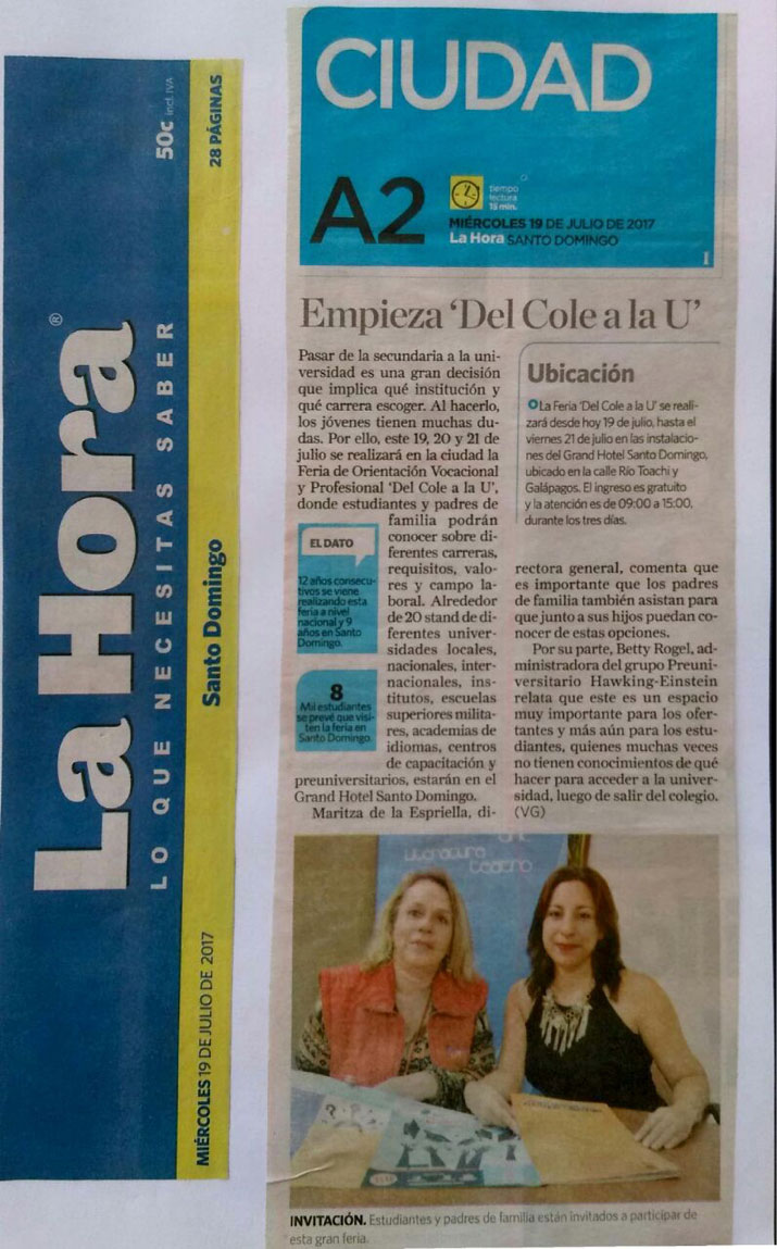 XXVI Feria «Del Cole…a la U» Santo Domingo 2016 – El Programa de Orientación Vocacional y Profesional “Del Cole…a la U”, presentó su XXVI FERIA DE ORIENTACIÓN VOCACIONAL Y PROFESIONAL, en el Grand Hotel Santo Domingo, del 20 al 22 de Julio de 2016.